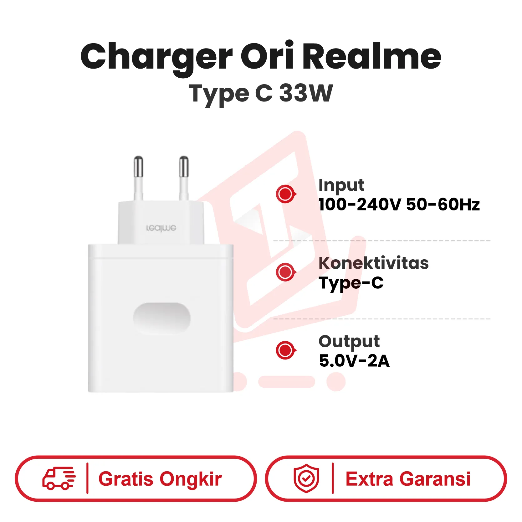 Charger Ori Realme 33W Type C — Travel adapter resmi Realme dengan output hingga 33 W dan dilengkapi konektor USB Type-C. Dirancang khusus untuk mengisi daya cepat berbagai perangkat modern, adapter ini mendukung protokol pengisian cepat seperti SuperVOOC/Dart serta memiliki fitur keamanan lengkap untuk pengisian yang aman dan efisien.