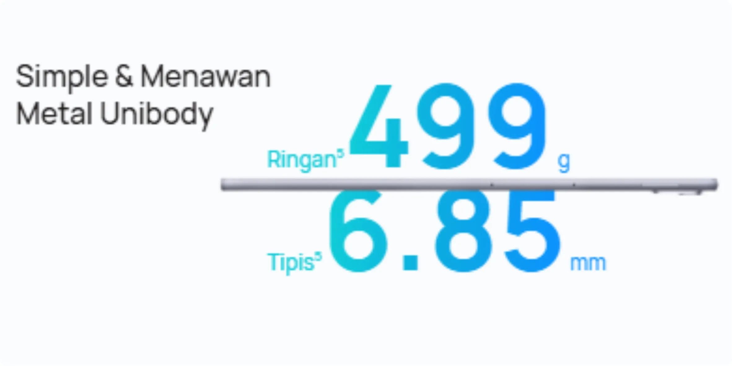 Dengan ketebalan hanya 6.85 mm dan berat 499 g, MatePad 11.5 memiliki bodi aluminium unibody yang kokoh namun ringan. Desain ini memberikan kesan premium dan kenyamanan saat digunakan atau dibawa bepergian.
