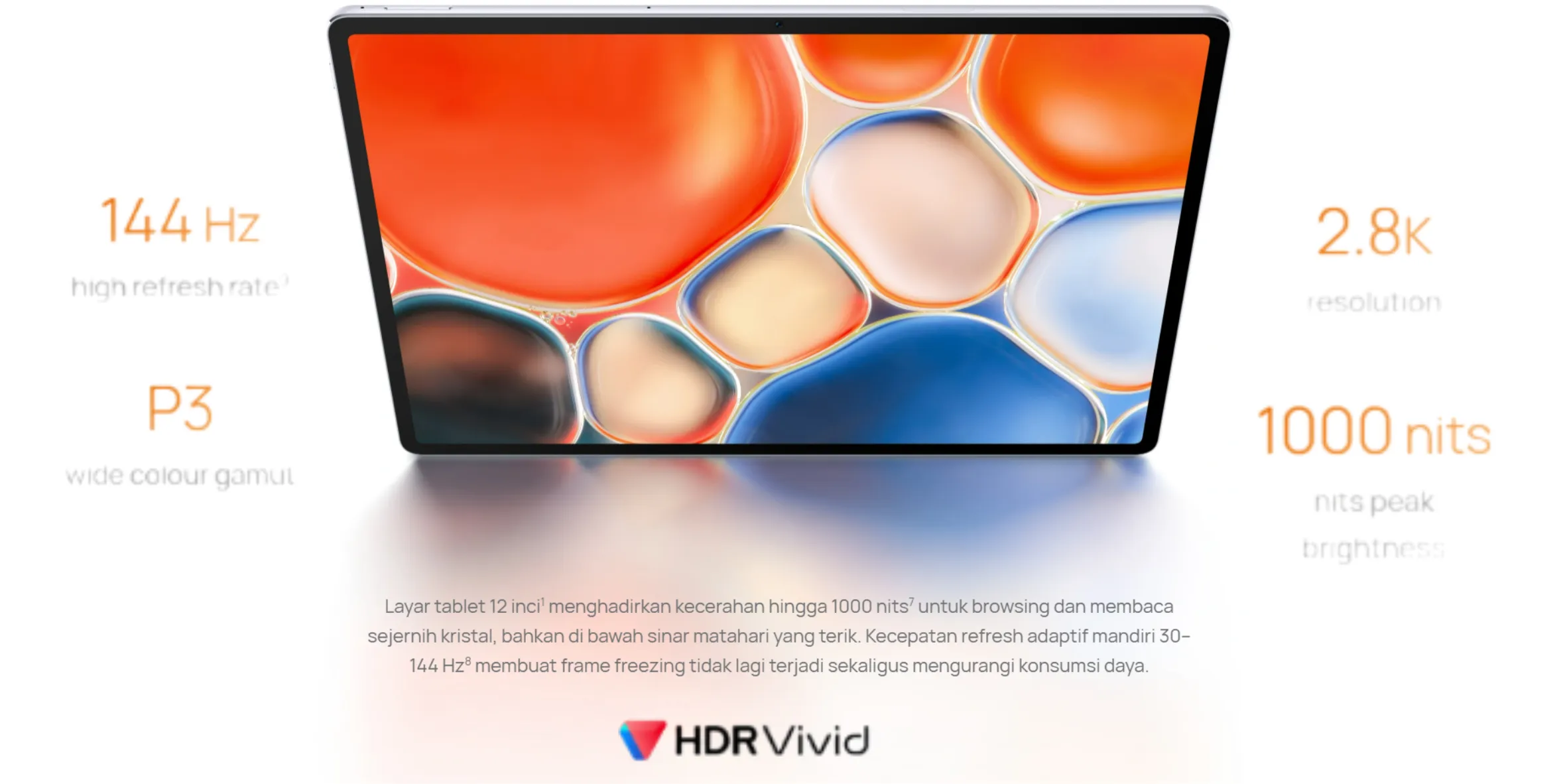 Nikmati pengalaman visual yang imersif dengan layar tablet 12 inci beresolusi 2.8K dan refresh rate adaptif 30-144 Hz. Dengan kecerahan puncak hingga 1000 nits dan dukungan P3 wide colour gamut, visual tampak lebih cerah dan jernih, bahkan di bawah sinar matahari. Kecepatan refresh adaptif membantu mengurangi konsumsi daya, sementara dukungan HDR Vivid menjamin kualitas gambar yang memukau.
