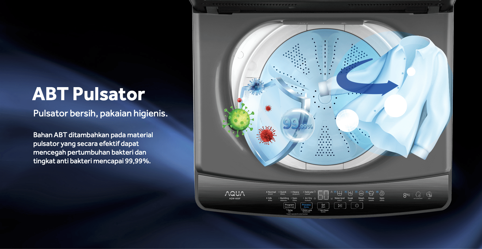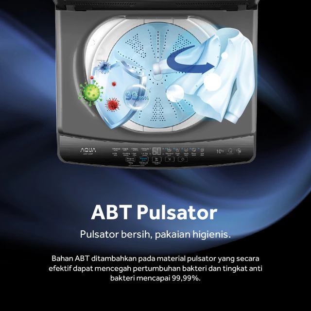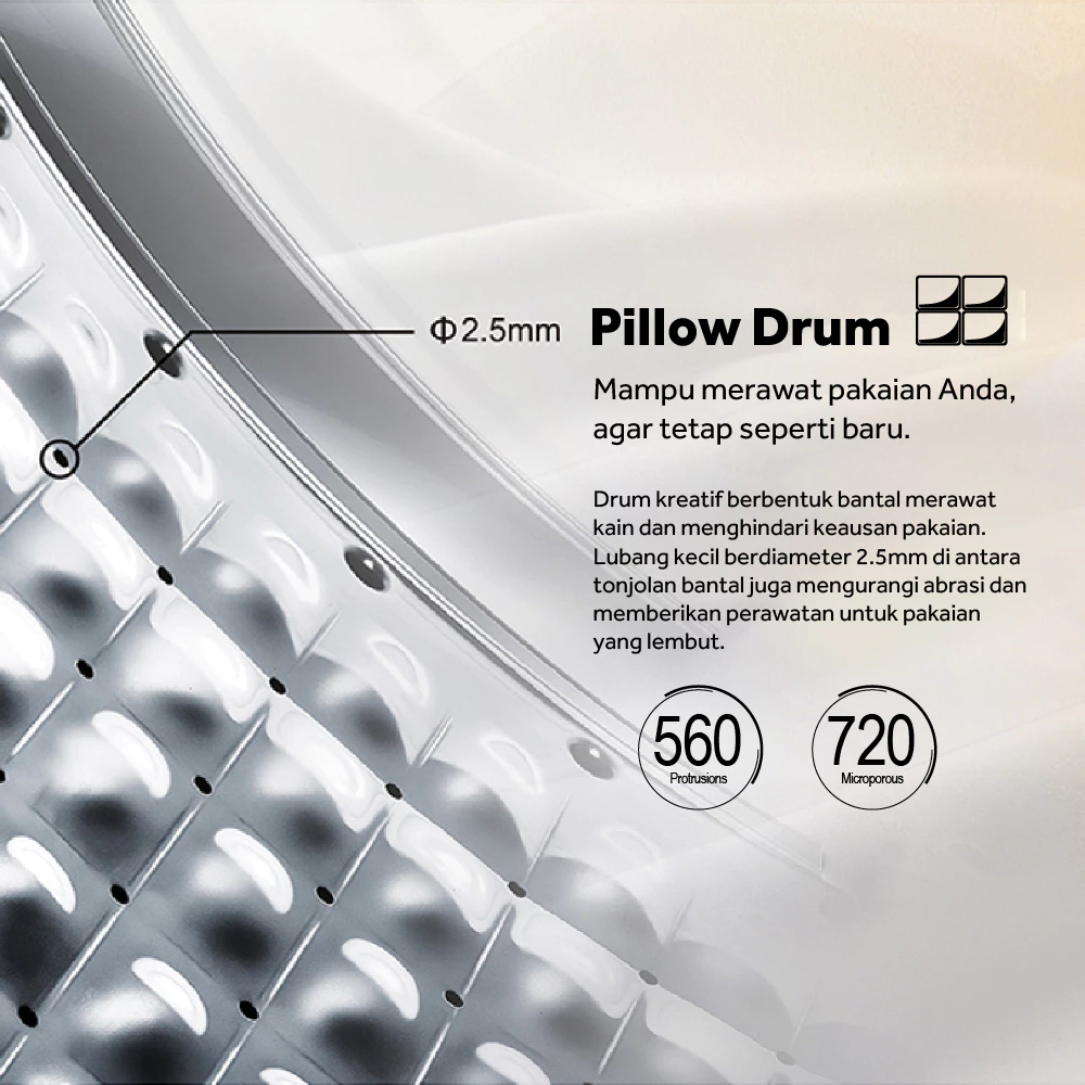 Dilengkapi Pillow Drum yang didesain untuk melindungi serat pakaian agar tidak mudah rusak selama proses pencucian. Selain itu, teknologi ABT (Anti Bacterial Technology) membantu menghambat pertumbuhan bakteri dan jamur, menjaga kebersihan serta kesehatan cucian keluarga.