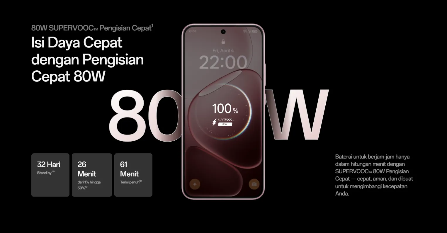 Smartphone ini mengusung baterai berkapasitas besar 7000mAh yang sangat awet untuk penggunaan intensif harian maupun streaming atau gaming. Dukungan pengisian cepat 80W memungkinkan waktu isi ulang yang singkat, hanya sekitar 60 menit untuk penuh. Fitur reverse charging juga membuatnya dapat digunakan sebagai power bank darurat.