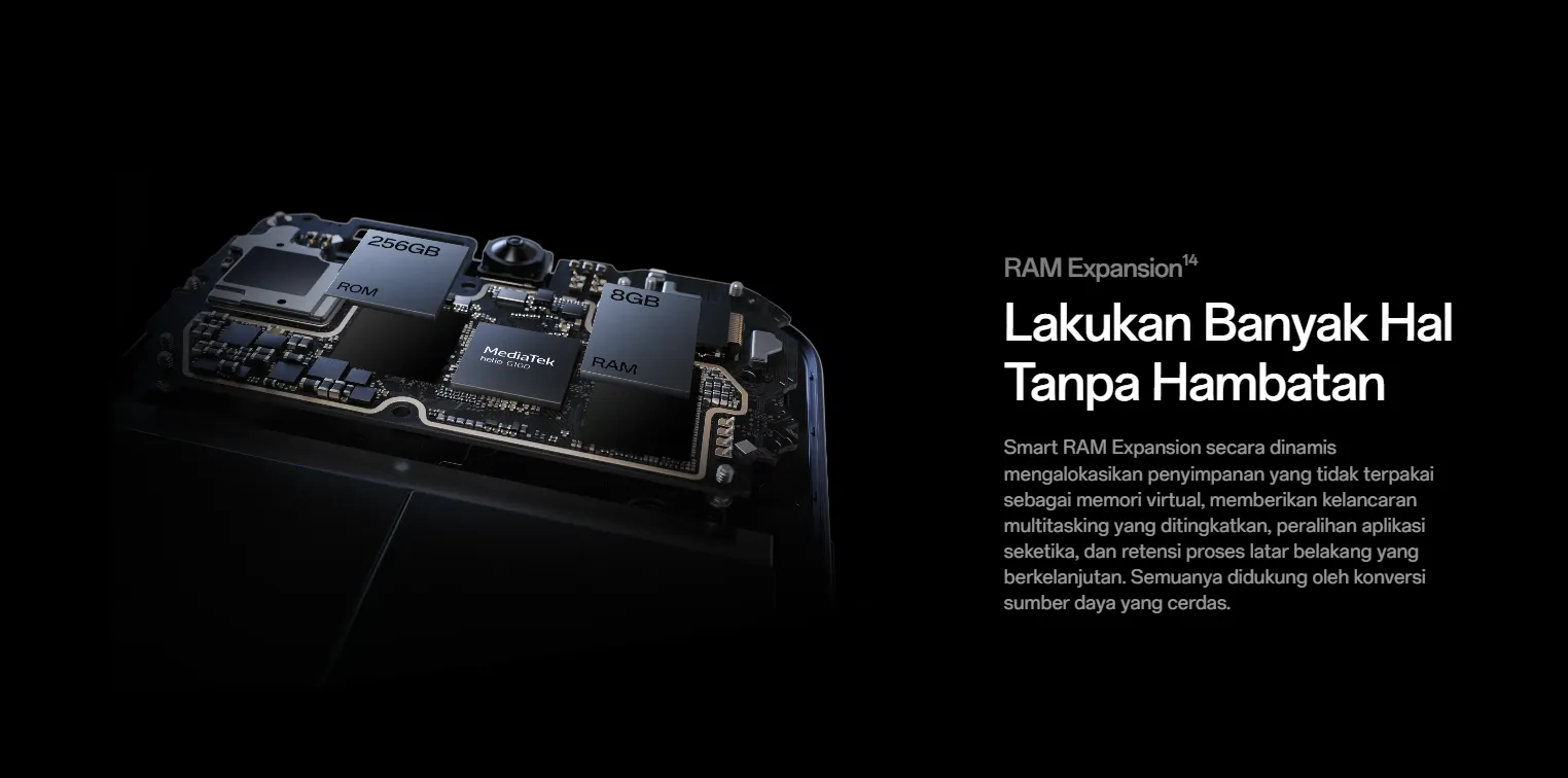 Chipset MediaTek Dimensity 6300 dipadukan RAM hingga 12GB (LPDDR4X) dan penyimpanan internal sampai 256GB (UFS 2.2), memberikan performa mulus untuk multitasking, gaming, dan konsumsi konten berat. Konektivitas lengkap mulai dari NFC, Wi-Fi dual-band, Bluetooth 5.4, hingga USB Type-C mendukung pengalaman digital yang modern