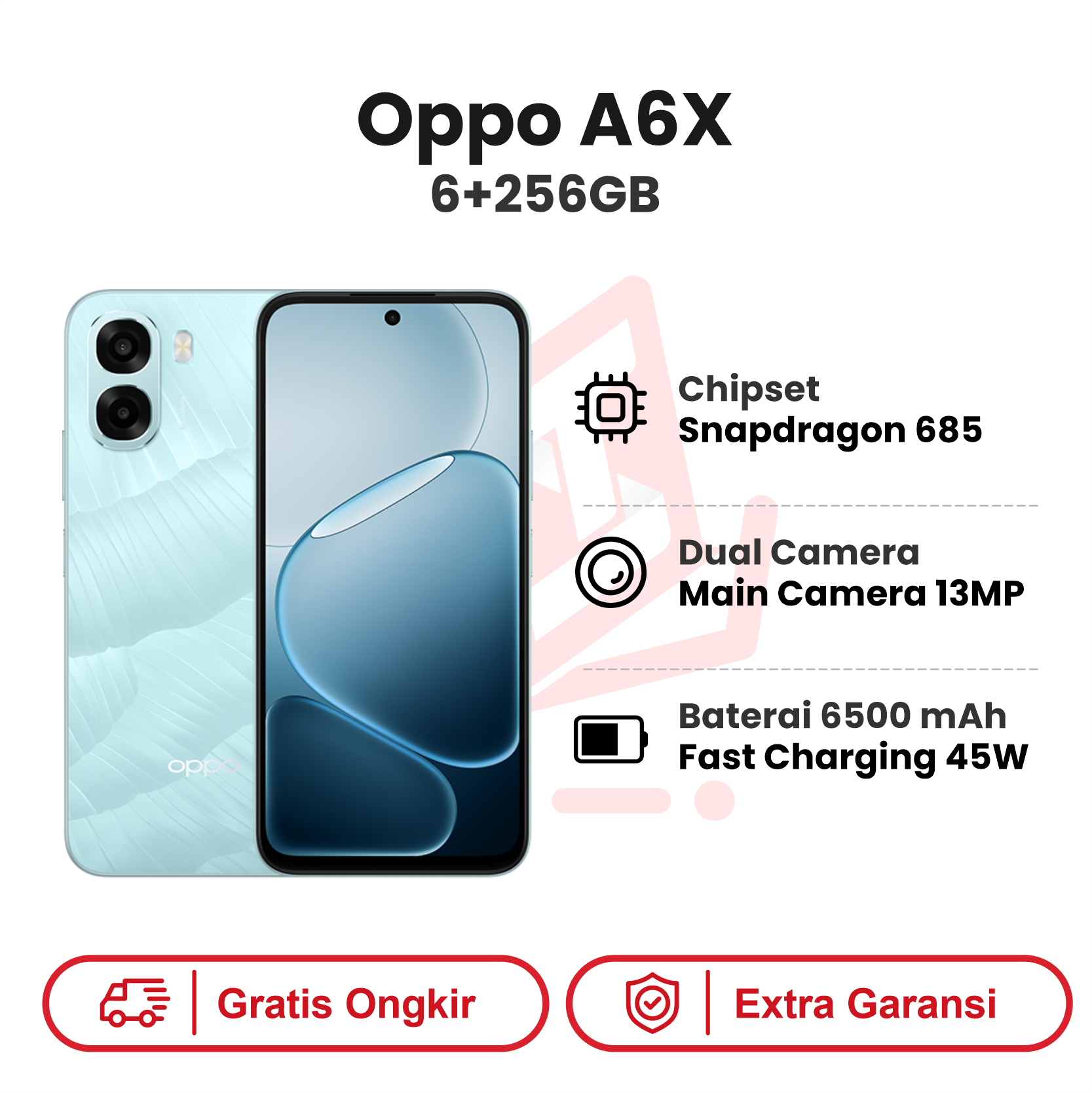 Oppo A6x 4+128GB menawarkan performa sehari-hari yang solid dengan baterai tahan lama dan layar lebar.