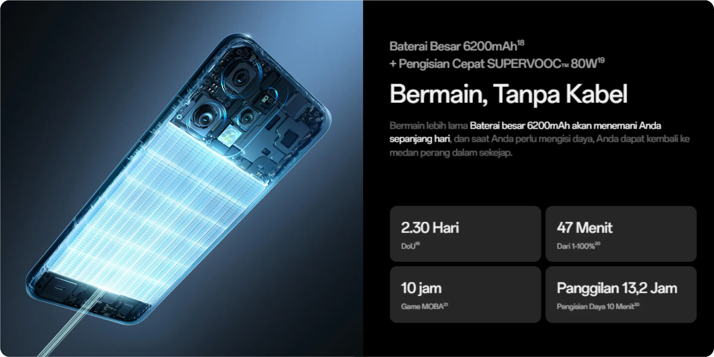 Bebas khawatir baterai cepat habis! Dengan kapasitas besar 6.200mAh, kamu bisa seharian aktif tanpa repot charging. Dilengkapi pengisian cepat 80W SuperVOOC dan 50W wireless charging (AirVOOC).