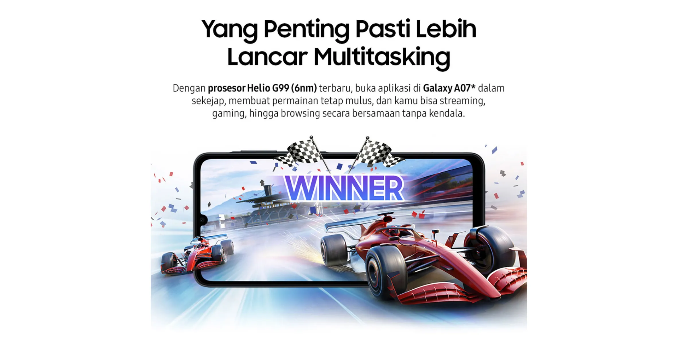 Menggunakan chipset MediaTek Helio G99 (6nm), Galaxy A07 memberikan performa lebih cepat dengan konsumsi daya rendah. Cocok untuk multitasking ringan, streaming, hingga gaming harian tanpa hambatan berarti.