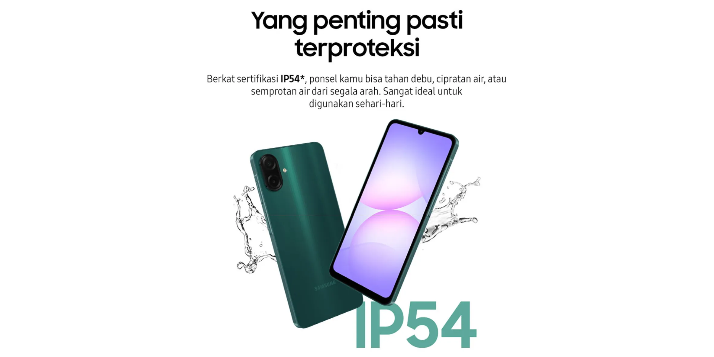 Dilengkapi sertifikasi IP54 yang tahan debu & percikan air, serta bodi ringan berbahan Glass Fiber Reinforced Polymer. Ditambah dukungan 6 kali upgrade OS & 6 tahun update keamanan, membuat Galaxy A07 tetap aman dan relevan untuk jangka panjang.