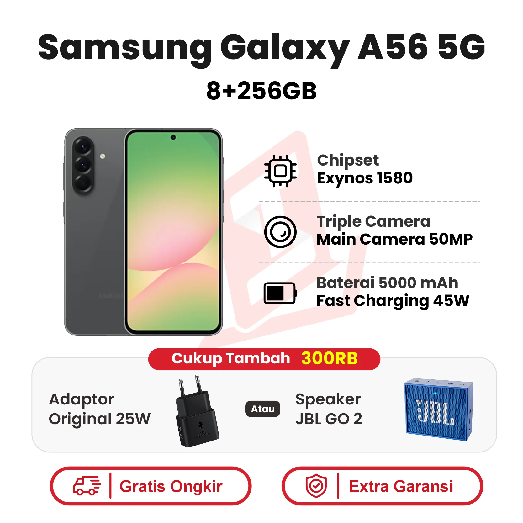 Dibekali baterai berkapasitas 5000 mAh, Galaxy A56 5G mampu bertahan hingga dua hari penggunaan normal. Fitur pengisian cepat 45W memungkinkan pengisian hingga 65% dalam 30 menit dan penuh 100% dalam 68 menit, memastikan Anda tetap terhubung tanpa gangguan