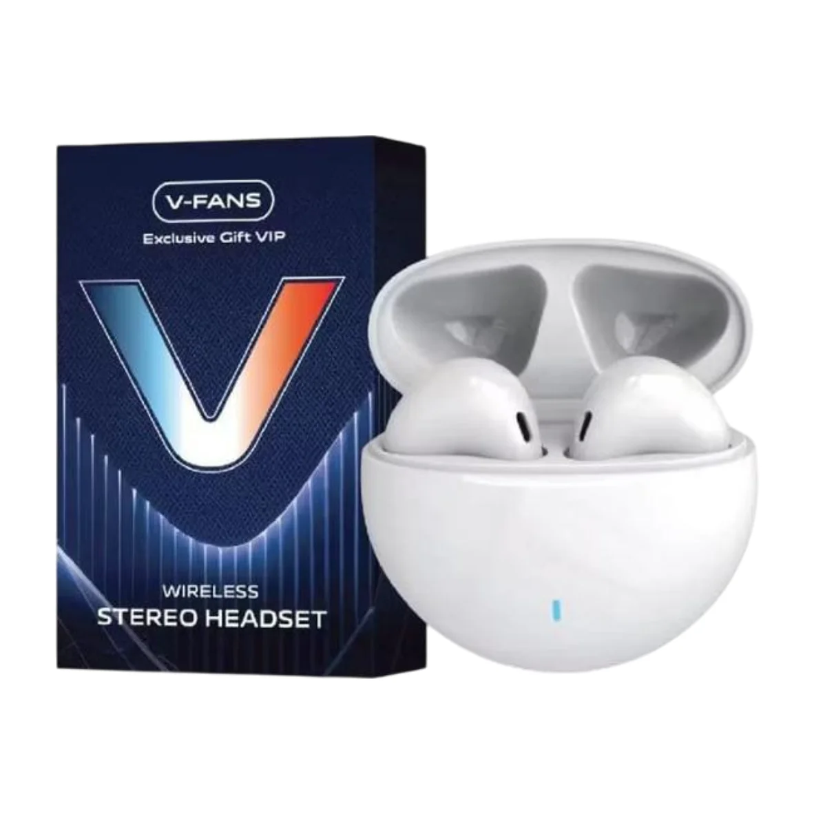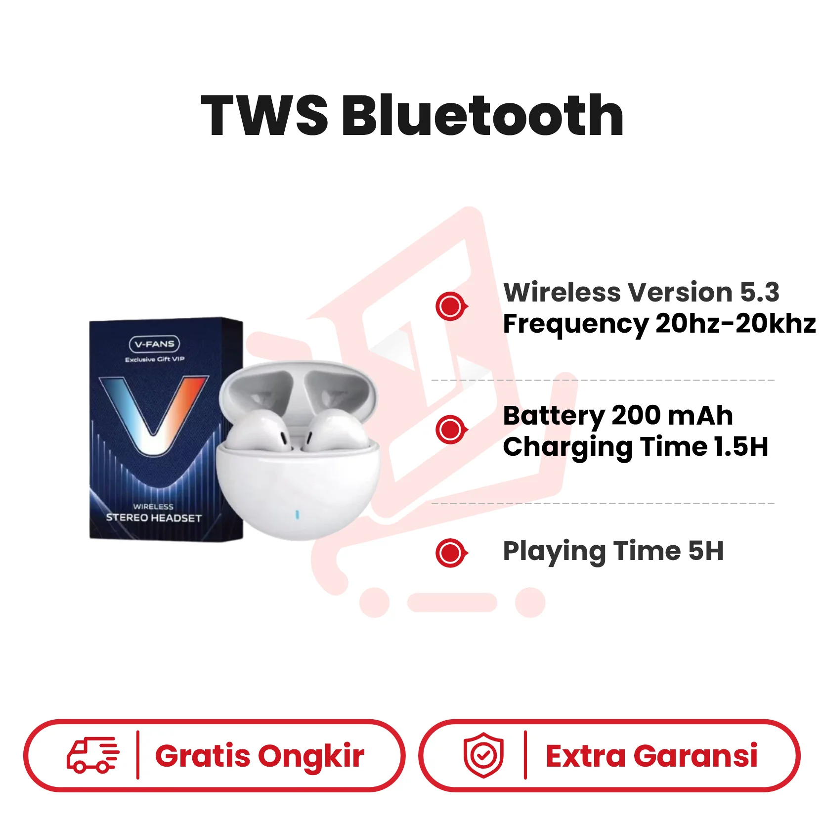 TWS Bluetooth V Vans adalah earphone true wireless stereo (TWS) yang dirancang untuk memberikan pengalaman audio nirkabel praktis dengan harga terjangkau, menggunakan konektivitas Bluetooth modern dan fitur-fitur yang sesuai dengan kebutuhan harian.