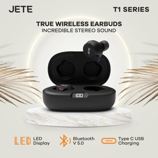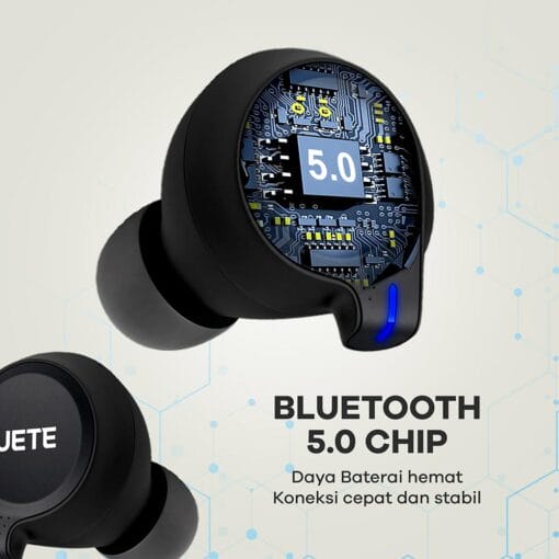 Headphone JETE series pertama tanpa kabel memberikan kenyamanan dan kebebasan tersendiri saat digunakan untuk mendengarkan musik dan mengelola panggilan anda dengan TWS JETE T1 series, kemampuan menghasilkan audio yang jernih dan super bass karena sudah di dukung koneksi Bluetooth V5.0.