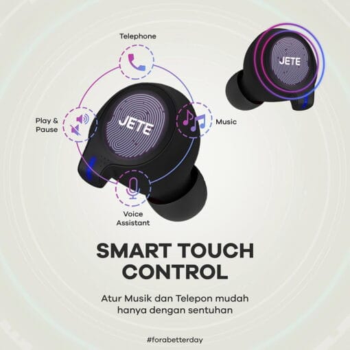 Nikmati audio selama 24 jam sepanjang hari, JETE T1 series juga dibekali fitur On/Off Touch Zone untuk melakukan mute/next, mengatur volume dan menerima atau pun meninggalkan panggilan telepon anda.